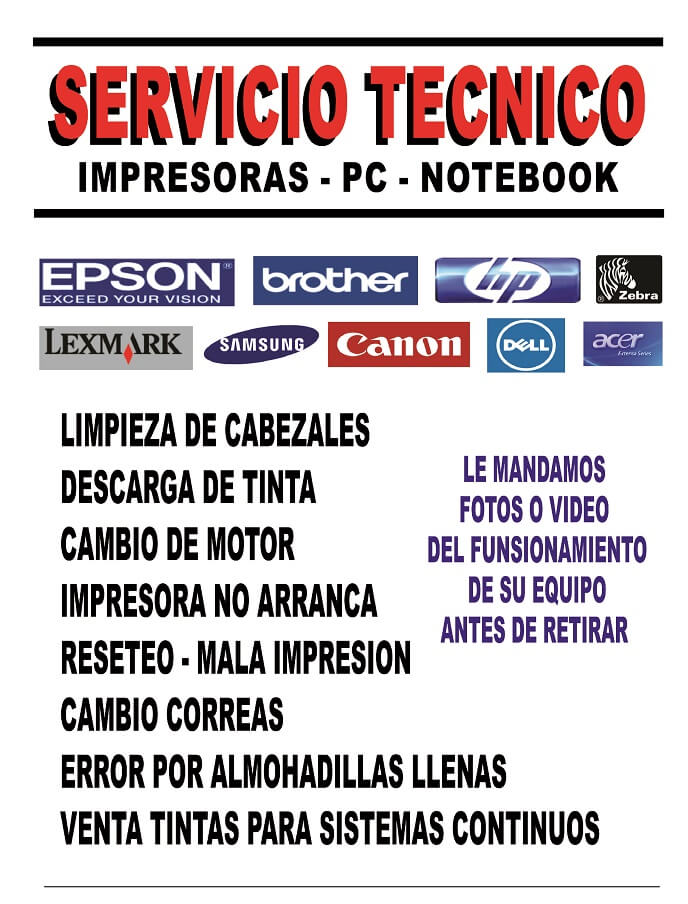 Reparamos impresoras Epson – Canon- Brother – HP de inyección de tinta – sistemas continuos – limpieza de cabezal – toma papel – actualizaciones Actualizaciones, Reparaciones, canjes, backup disco rígido y mucho más…